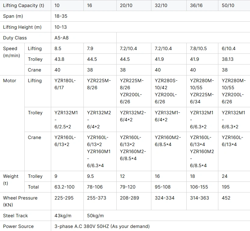 Lifting speed: 20–26 m/min (with load), 40–55 m/min (no load)